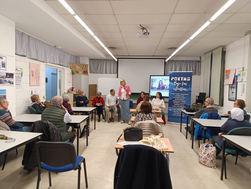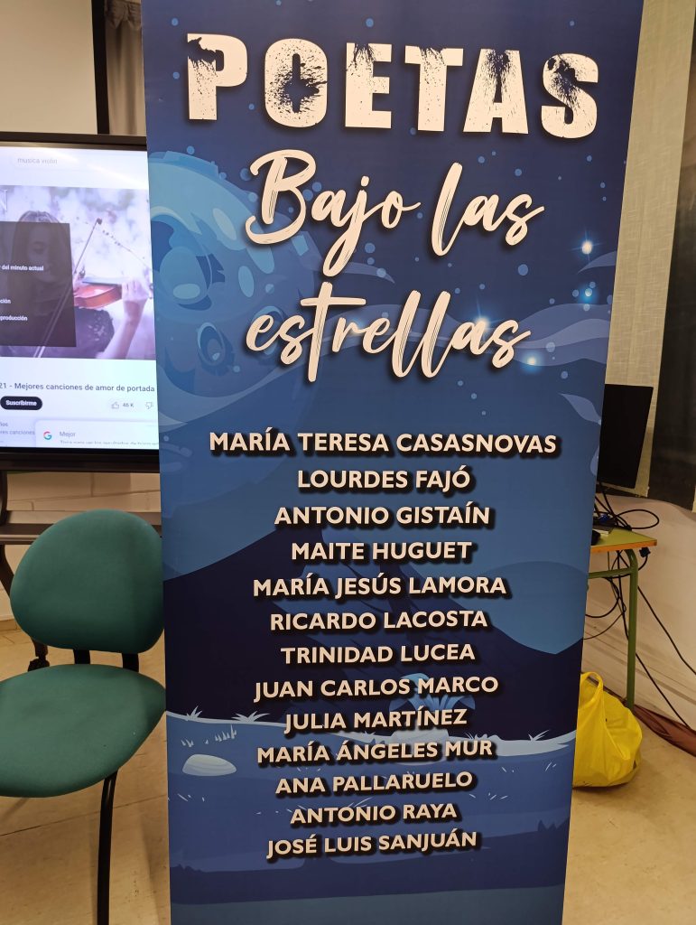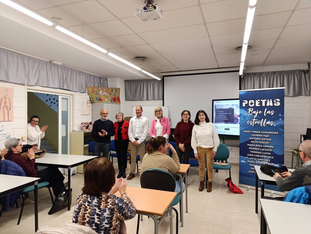 Celebramos en el CPEPA Bajo Cinca el Día Mundial de la Poesía y que mejor forma de hacerlo que compartiendo una sesión alumnos y profesores, con seis de los catorce integrantes del grupo Poetas bajo las estrellas. Cada uno de ellos nos ha deleitado con la lectura de sus producciones, y ha sido maravilloso escuchar sus palabras y emociones. Nos han contado que les ha gustado mucho compartir su arte con nosotros, y nosotros, a su vez, hemos disfrutado enormemente de esta experiencia enriquecedora.