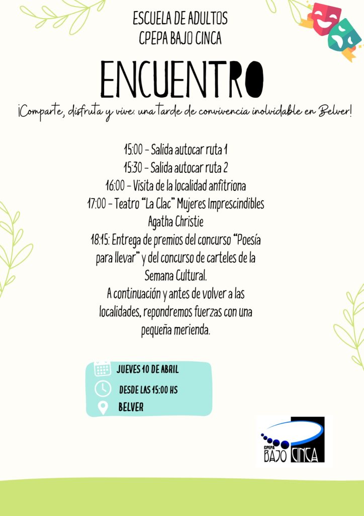El próximo 10 de abril tendremos una jornada de convivencia en Belver de Cinca en la que participará el alumnado de las aulas del CPEPA Bajo Cinca . Será una gran oportunidad para que el alumnado del centro de adultos se reúna, comparta experiencias y disfrute de un buen rato juntos. Os dejamos la programación de las actividades que realizaremos ¡Esperamos que puedas unirte y disfrutar de esta actividad! . 😊